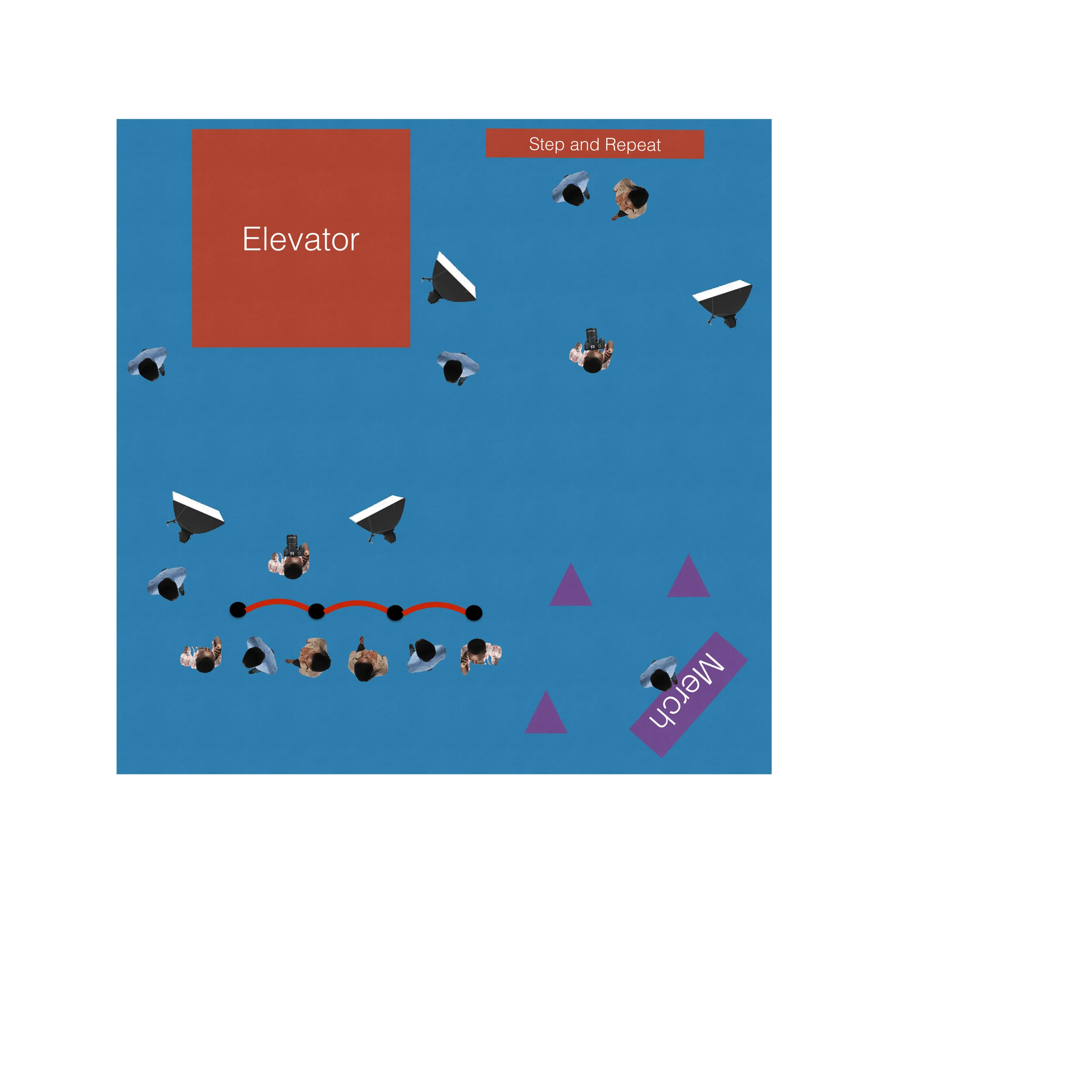 two filming areas with cameramen and studio lights -- for the filming areas in front of elevator and in front of step and repeat.