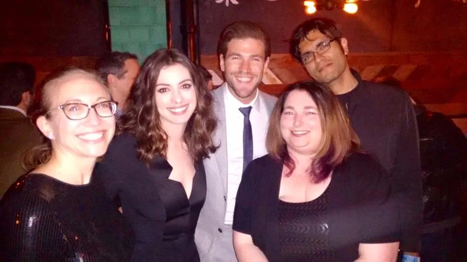 Legion M investors Meredith Schindehette and MeriJewel Burr with Anne Hathaway and Austin Stowell