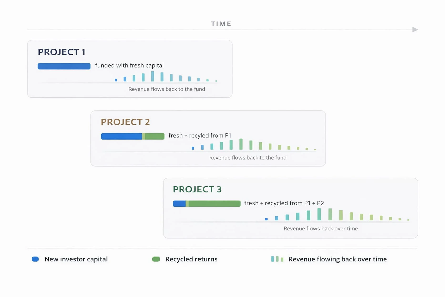 By default, returns from investments may be reinvested or rolled forward in accordance with the governing documents. Investors may have limited rights to request redemptions or distributions, subject to timing, availability of funds, and other restrictions described in the applicable offering materials. Capital invested in active projects generally cannot be returned until those projects are completed or otherwise monetized.